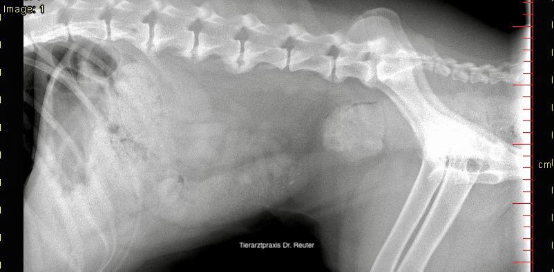 Auf dem Röntgenbild sieht man den massiv vom hellen Knochenkot gefüllten Enddarm. Der Hund konnte diesen nicht absetzten. Wir haben den Kot in Narkose vollständig aus dem Enddarm entfernen können. Wenn Sie dies vermeiden möchten, füttern Sie Ihrem Hund einfach keine Knochen, auch wenn das gerade stark im Trend ist.
